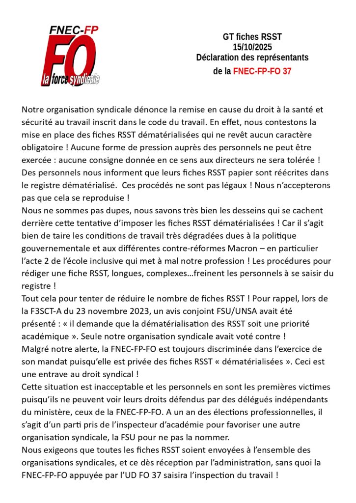 La FNEC-FP-FO est intervenue sur des fiches RSST version papier réécrites par des IEN en version dématérialisée ! Cela part dans tous les sens pendant que les conditions de travail se dégradent, les fiches RSST disparaissant au profit de simples « observations » remontées, sans réponse !