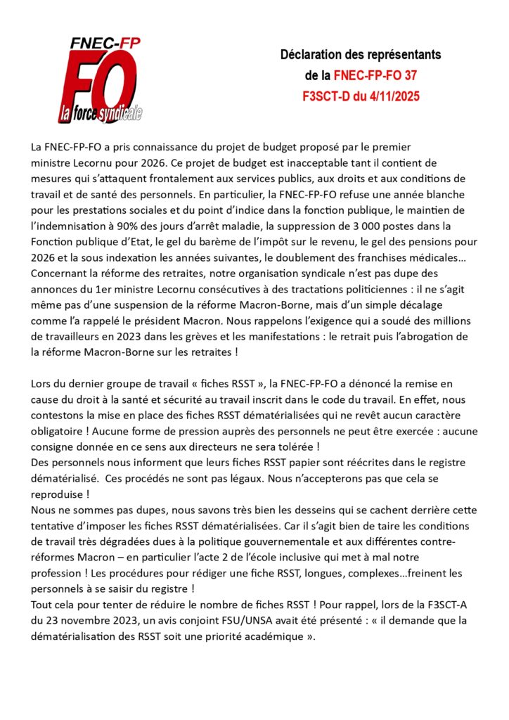 Retrouvez ci-dessous la déclaration de la FNEC-FP-FO