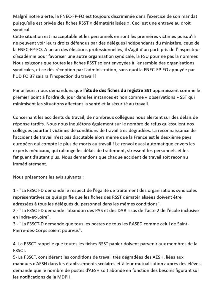 La FNEC-FP-FO 37 résiste en essayant de faire fonctionner la F3SCT comme un CHSCT ! Pour la défense de chaque fiche RSST !